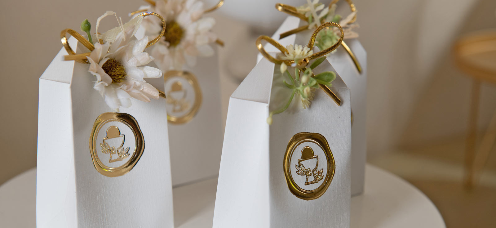 Die Erstkommunion 2024 von Florentina präsentiert eine Schachtelkollektion für Zuckermandeln. Das Design ist geradlinig, elegant und raffiniert. Spitztüten, Anhänger, Sechseckschachteln und Schatullen sind in der neuen weißen Faserprägung gefertigt: die leichte, fast nicht wahrnehmbare Oberfläche, erinnert an die Textur eines edlen Stoffes. Die mit handwerklichem Geschick hergestellten Schachteln sind mit einem zarten Wachseffekt versehen, in dem ein Goldkelch eingeprägt ist. Er ist ein Symbol für den heiligen Moment und erinnert an die Bedeutung des Kelches bei religiösen Feiern. Eine schlichte, raffinierte Linie, die sich durch ihre Vielseitigkeit auszeichnet, da sie für Junge und Mädchen gleichermaßen geeignet ist. Die Schachteln können auch ganz einfach mit dem Namen des Kindes und dem Datum des Ereignisses versehen werden, so dass sie zu einem besonderen Andenken werden, an das man sich gerne erinnert.