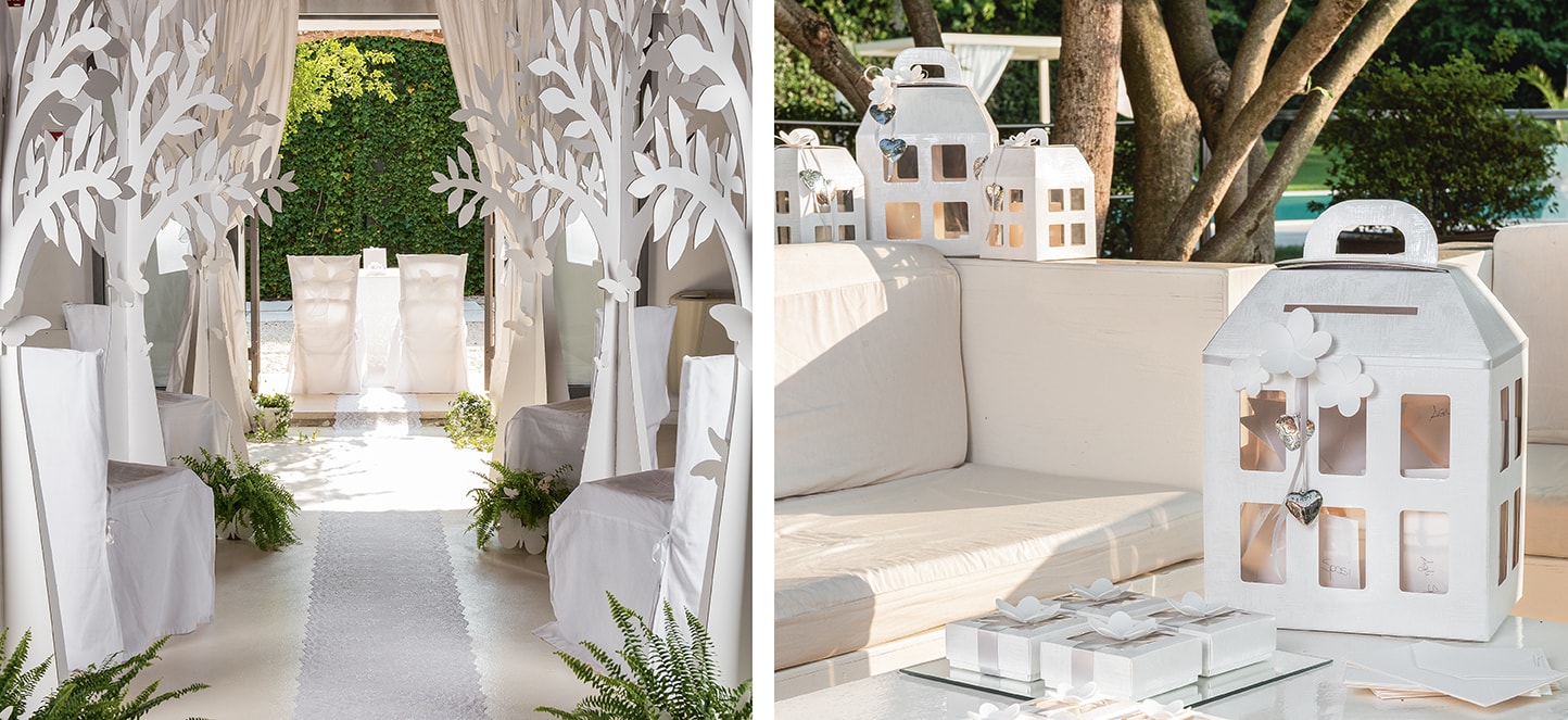 Alles beginnt mit dem Wort „JA“! Ein solch denkwürdiger Moment verdient eine Kulisse von hohem szenischem Wert. Weiße Bäume und zarte Schmetterlinge schaffen eine romantische und märchenhafte Atmosphäre, die aber gleichzeitig modern und minimalistisch genug ist, um einen sicheren WOW-Effekt zu erzielen! Ebenso wie der Kontrast zwischen dem Grün eines schönen Rasens und dem Weiß der Hocker und Schmetterlinge auf dem Boden, die den Weg des Brautpaares markieren. Kleine Tische, Bücherregale und Häuschen dienen als nützliche Ablagen, die nach Belieben eingesetzt werden können. Alle Kartonartikel dieser Kollektion bilden vielseitige und wirkungsvolle Dekorationen, die ein wichtiges Ereignis wie eine Hochzeit in Szene setzen sollen.